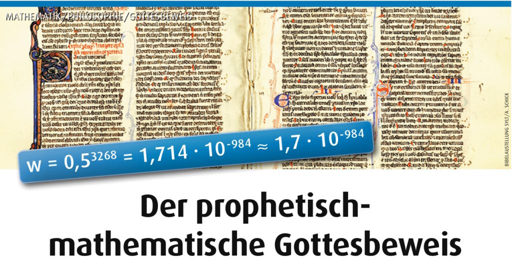 Der deutsche Informatiker Prof. Dr. Werner Gitt hat berechnet, dass sich bis heute bereits 3.268 Vorhersagen in der Bibel erfüllt haben. Lesen Sie hier in seinem prophetisch-mathematischen Gottesbeweis: